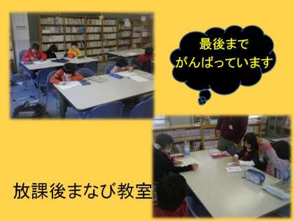 今日も,放課後まなび教室が行われています。参加人数は少ないですが,子どもたちは,一生懸命宿題をしたり,復習プリントをしたりしてがんばっています。