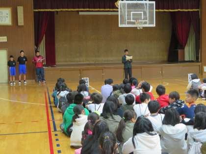 栗陵中学校に到着すると,生徒会の人たちが中学校の部活動について説明してくれました。そして,各部活動のキャプテン・部長に連れられて活動場所に移動していきました。
