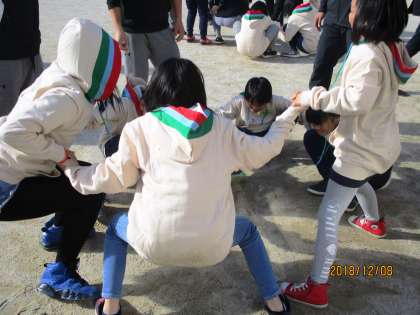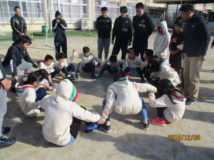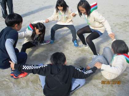 みんなで足をくっつけて一斉に手を使わずに立ち上がります。心がひとつにならないと立てません!人数が増えると難しい!