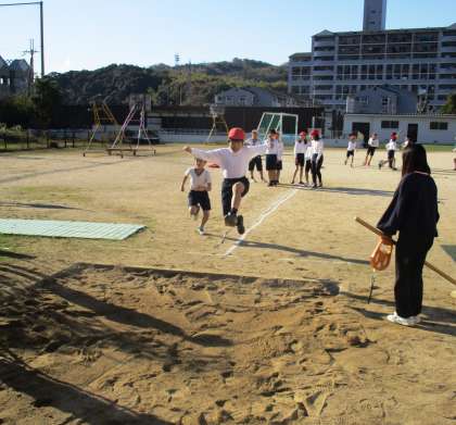 走り幅跳びをしています。待っている間はなわとびの練習をしています。