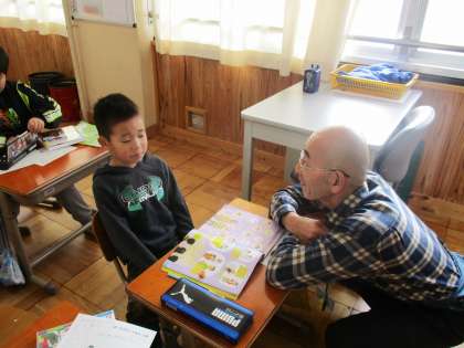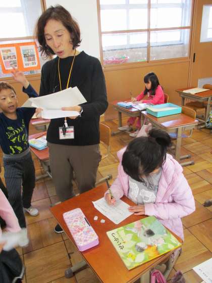 今日は,家族の“にこにこ”を探しました。たくさん考えて,先生に「見て見て!」と見せに来ています。「おてつだいをしたとき」「たんじょうびに,おめでとうをいったとき」「あかちゃんがないているときに,おもちゃをならしたら」いろいろな家族のにこにこがありますね。
