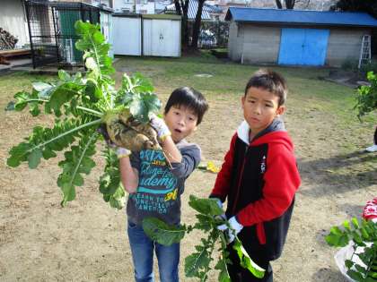 地域の方にお世話になりながら育てた大根とかぶを収穫しました。大きな大根にみんなにこにこです。