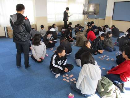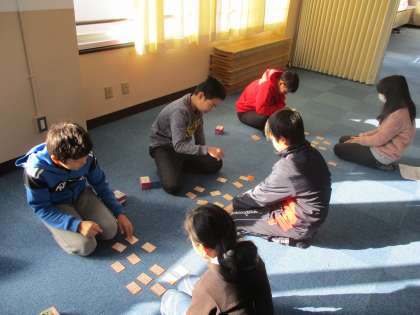 1・2組合同で百人一首をしています。今年の色はオレンジです!