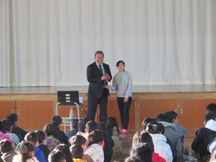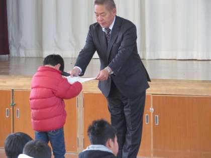 始業式では,校長先生よりこれまで無遅刻無欠席でがんばっている子どもたちの紹介がありました。また,3学期から新たに醍醐西小学校に転入してきた友だちの紹介と人権作品コンクールの出展者の表彰も行われました。