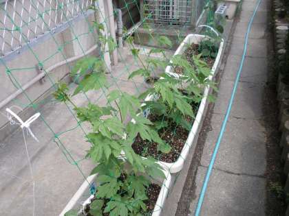 「緑のカーテン」のために育てている「ゴーヤ」「ヘブンリーブルー」が順調に育っています。昨日の雨で一段とツルがのびました。でも日よけになるためには,まだまだ日数がかかりそうです。