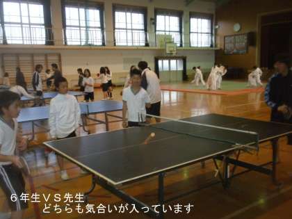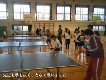 まずは,卓球部の子どもたちと先生たちが対戦しました。どちらも負けたくないので意地になって勝負していました。