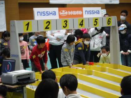 レース発信前には,カウントダウンが始まります。「5・4・3・2・1GO!!」と一斉に車が飛び出していきます。会場みんなでのカウントダウンはとても迫力があって,スタートが一番緊張する瞬間でした。どの選手も「最後まで走りきれ!」と願いを込めて,自分の車から手を放して,コースを真剣な目で見守っていました。