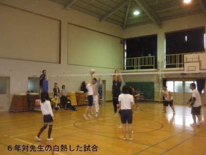 今日は,部活動「バレーボール」のお別れ試合がありました。6年生対先生チームの試合です。