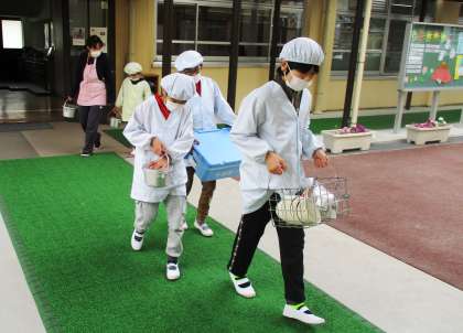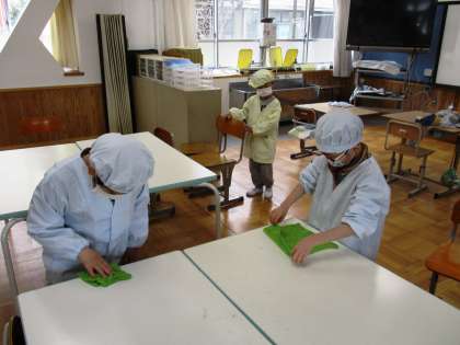 みんなで力を合わせて給食の準備です!机もピカピカに拭いて準備OK!
