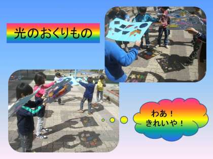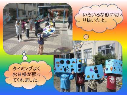 今日は,中庭に出て,お日様に照らされて地面にうつった模様を観察しました。単純な○や◆,そして星形や英語のSやAなど,いろんな形に切り抜いて楽しんでいました。