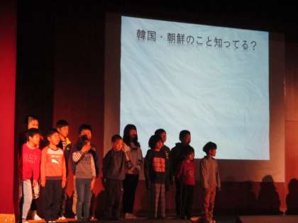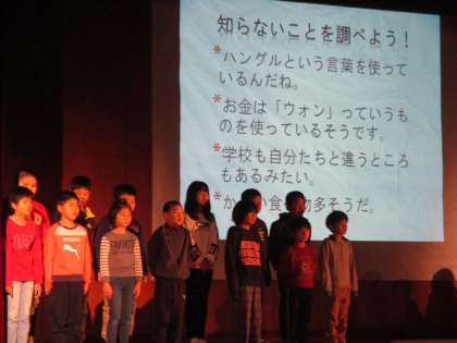 3年生の発表です。3年生は,京都朝鮮初級学校の友だちとの交流のこと,そして交流を通して考えたことを発表しました。韓国朝鮮の文化をはじめ,自分たちの知らないことや疑問がたくさんあり,それを少しずつ知っていくことで友だちとどんどん仲良くなっていったことがよくわかりました。