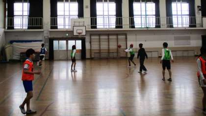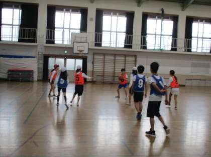 バスケットボールをしています。グループで作戦を立てながら試合をしています。