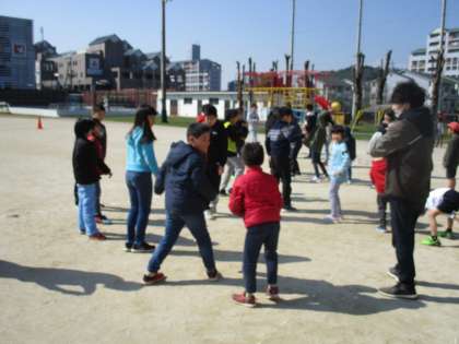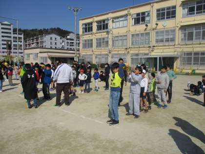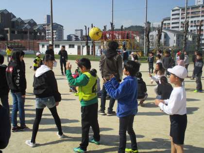 たてわりグループで協力し、1年生から6年生まで楽しくボールをつないでゲームに参加することができました。