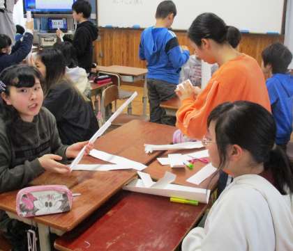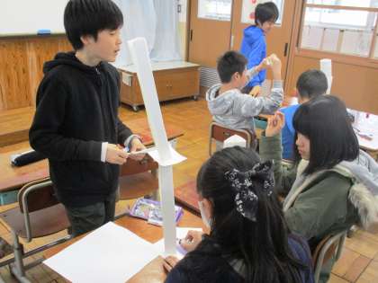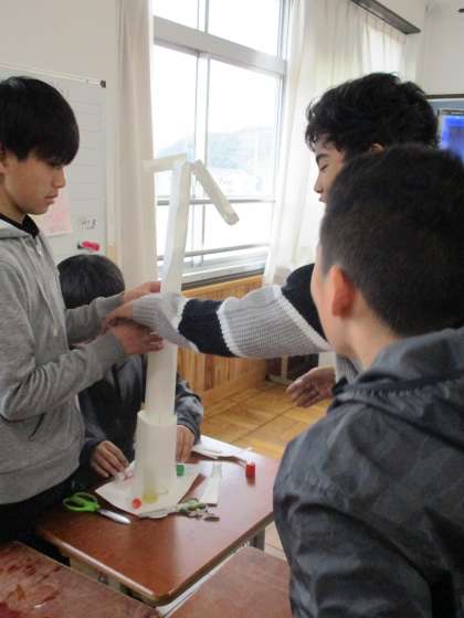 ペーパータワーをグループで作っています。ルールは,10分間で作ったタワーが高いチームが勝ちです。