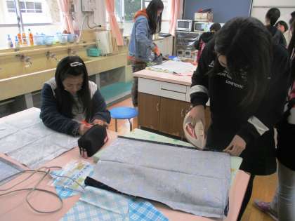 ミシンを使ってランチョンマットを作ります。今日はアイロンで折り目をつけました。