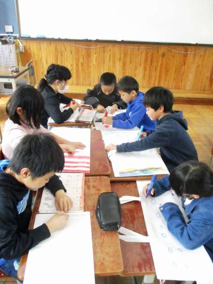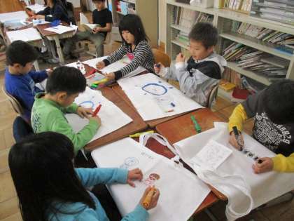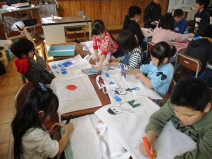 作品バッグに思い思いの絵を描いています。2年生の思い出を入れて持って帰ります。