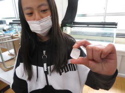 「もののとけ方」の発展学習,ミョウバンの結晶作りで出来上がった結晶と「ふりこの動き」の実験のようすです。