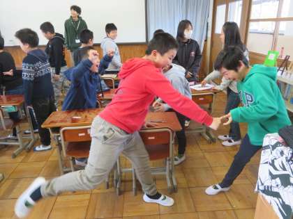 6年生は,学級開きに3つのゲームを行いました。写真はその中の一つ「全力じゃんけん」をしているときの様子です。このゲームの目標は「心の開放」で,全力で声を出して行い,じゃんけんに勝ったら全力で喜び,負けたらもっと喜び,あいこだったらさらに喜ぶ。ということを行っていました。元気があるということは,最高のクラスの条件の一つだと考えています。その元気を引き出すためでもありました。