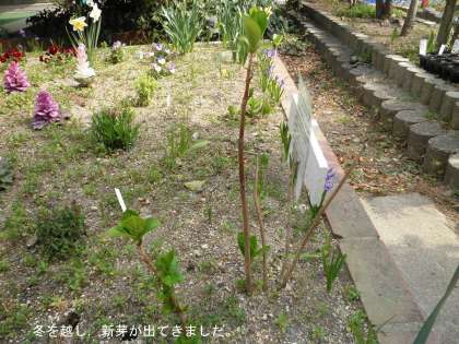 昨夏に,本校には「アジサイ」がないので,お隣の中山保育園の園長先生から「アジサイの挿し芽をいただき,玄関前の花壇に植えました。それが寒い冬を越し,4月に入ってから新芽が出てきました。