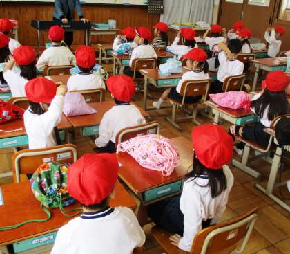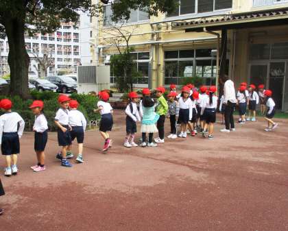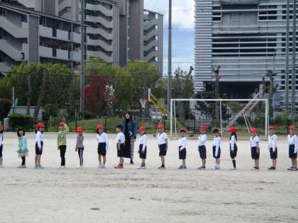 初めての体育。着替え方から練習です。脱いだ服もしっかり片づけて外に出て並ぶ練習をしました。