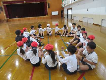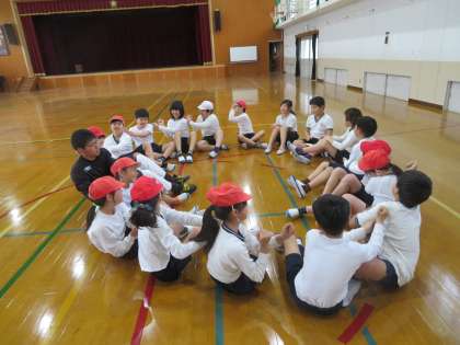 5年生1組では,体育科の学習で「体ほぐしの運動に」取り組みました。クラスで円になり,隣の人の肩をほどよい強さで歌に合わせてリズムよくたたきます。友だちの体と心をほぐす運動です。こういった体育科の学習でもお互いのことを知り,クラスのつながりを深めたいと思います。