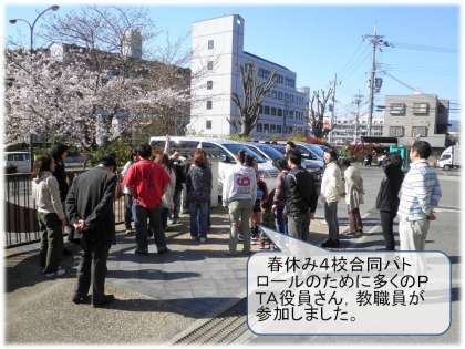 本校の正門前にはPTAの新旧の役員さんと教職員が多く集まり,校区を3グループに分かれてパトロールしました。