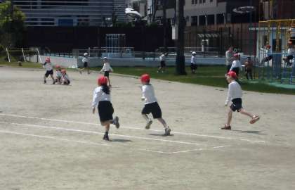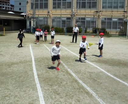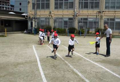 50m走を測りました。測り終わった後も,「もう1回走る!」と自分たちで並んで順番に走っていました。やる気満々ですね。