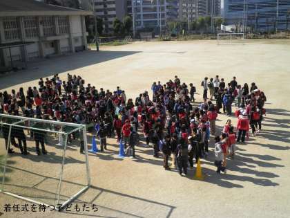 運動場に集合してから,体育館に入り,最初に23年度教職員着任式にのぞみました。