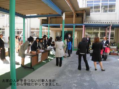 10時前から,お家の人に手をつながれて,新入生が学校に登校してきました。
