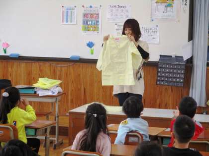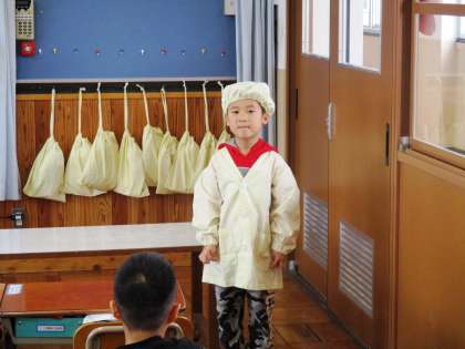 エプロンの着かたもばっちり練習しました。6年生のお兄さんお姉さんに手伝ってもらって,給食の配膳にもチャレンジしています。手伝ってくれてありがとう!