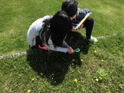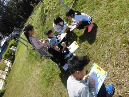 今日はタンポポの色や形,大きさについて観察し,「見つけたよカード」に書いていました。