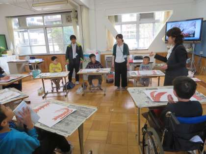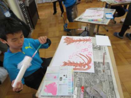 3くみでは,昨日の参観授業で図画工作科「さくらの絵を描こう」を行いました。筆だけでなく,番う道具を使って桜の花を描きました。一人一人がイメージする桜の絵が完成していきました。