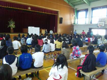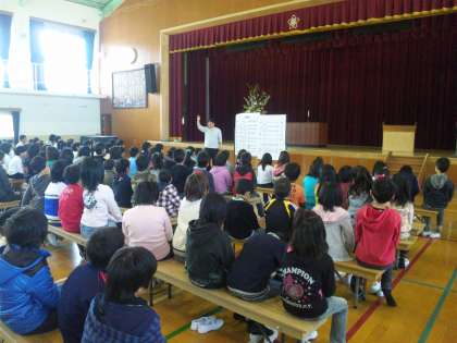 中間休みに体育館で4年生以上の子どもたちを対象に,今年度の部活動の説明会を行いました。