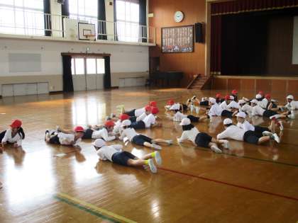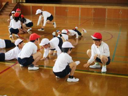 体ほぐしの運動をしました。『進化じゃんけん』をして楽しく活動しています。
