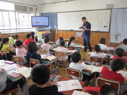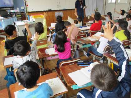 漢字の「音」と「訓」について学習しています。先生の読み方が合っていたらパー,間違っていたらグーで合図。みんな素早く反応しています。
