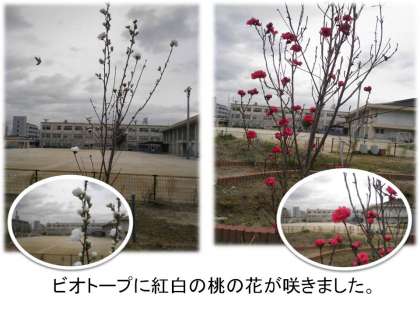 そして,学校では,桃の花も咲きはじめました。まだ小さな苗木ですが,白桃,紅桃がビオトープにきれいに咲いています。
