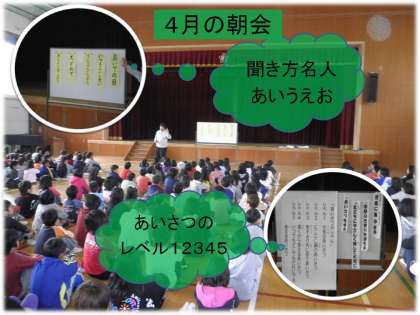 担当の先生から,朝会や集会,授業中の話の聞き方についてのお話し「聞き方名人あいうえお」がありました。