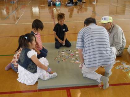 子どもたちには,「はごいた」「おてだま」「めんこ」「こままわし」など昔の遊びを地域の方々に教えてもらい,楽しいひとときを過ごしました。