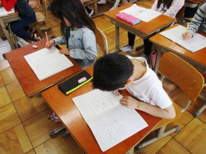 くり上がりのある2けた+1けたの計算について学習しています。10のまとまりを作ることで,しっかり計算できるようになりました。