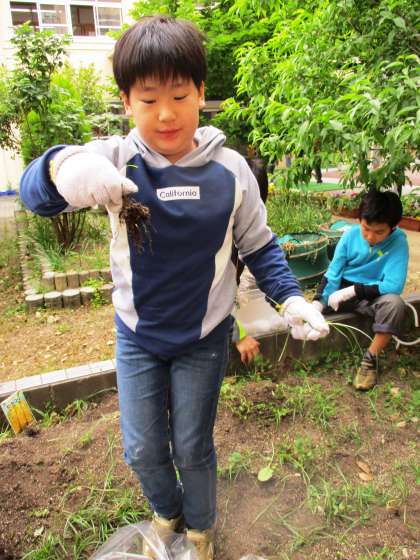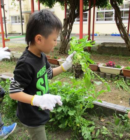 ほうれん草の収穫と草ひきをしました。大根も大きくなあれ!