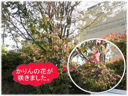 正門前の桜の木の隣に「かりんの木」があります。満開の桜にかくれていましたが,今朝,きれいな赤色の花が咲き始めているのに気がつきました。