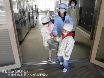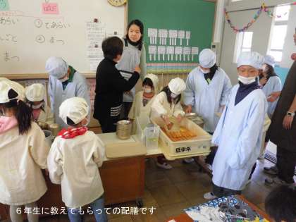 まだ,何もわからない1年生ですので,6年生の給食当番が手伝いにきてくれました。