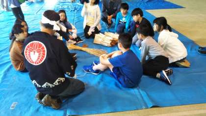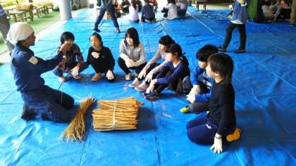 グループに分かれて地松づくりに取り組みます。松明のつくり方を地元の方から聞きます。