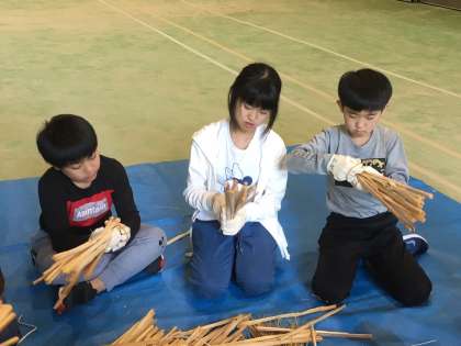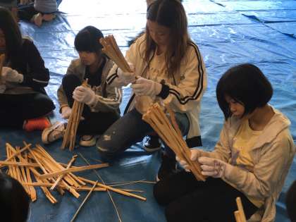一人一人,今夜火を灯す地松づくりに取り組み始めました。作り方のお手本を見せてもらっているときは簡単そうに見えましたが,実際にやってみると思っていたよりも難しいです。特に藁を結ぶのが思うようにいきません。そこで,結び方のコツを教えてもらっています。