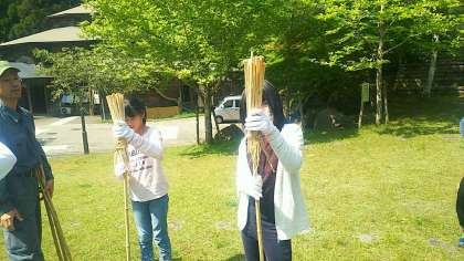 出来上がった松明を,地面に突き刺した竹に付けていきました。これが松上げのときどのようになるのか楽しみです。