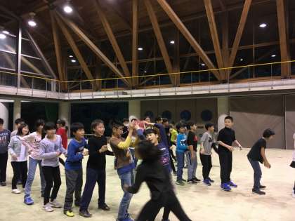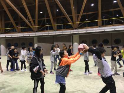 夕食後は,スポーツ大会です。メディシングボールリレーで盛り上がっています。