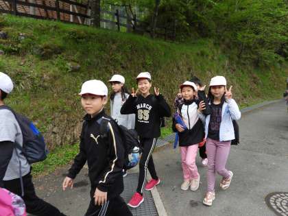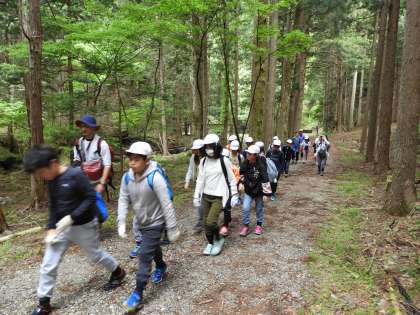 今日の午前中の活動は登山です。「三本杉」という大きな杉を目指して登っていきます。みんな元気いっぱいで,話をしながら楽しそうに登っています。