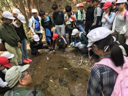 途中で,水たまりにオタマジャクシがいるのを見つけました。