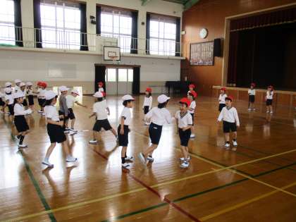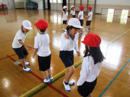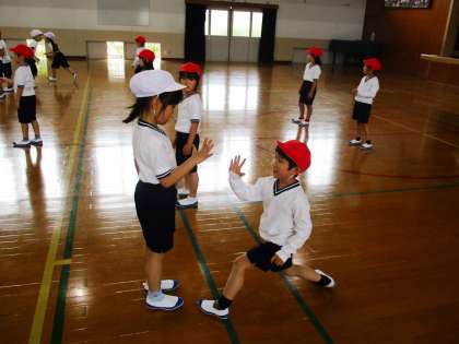 『王様じゃんけん』をして楽しんでいます。ルールが分かると,元気に走り回ってじゃんけんを楽しみました。