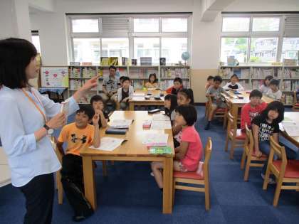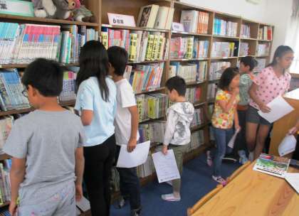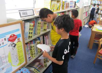 図書館の使い方についてのオリエンテーションをしていただきました。本のラベルについて説明していただき,実際に本を探しました。全部見つかったかな?